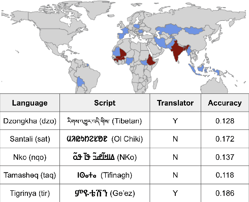 Abstract:Extremely low-resource languages, especially those written in rare scripts, as shown in Figure 1, remain largely unsupported by large language models (LLMs). This is due in part to compounding factors such as the lack of training data. This paper delivers the first comprehensive analysis of whether LLMs can acquire such languages purely via in-context learning (ICL), with or without auxiliary alignment signals, and how these methods compare to parameter-efficient fine-tuning (PEFT). We systematically evaluate 20 under-represented languages across three state-of-the-art multilingual LLMs. Our findings highlight the limitation of PEFT when both language and its script are extremely under-represented by the LLM. In contrast, zero-shot ICL with language alignment is impressively effective on extremely low-resource languages, while few-shot ICL or PEFT is more beneficial for languages relatively better represented by LLMs. For LLM practitioners working on extremely low-resource languages, we summarise guidelines grounded by our results on adapting LLMs to low-resource languages, e.g., avoiding fine-tuning a multilingual model on languages of unseen scripts.