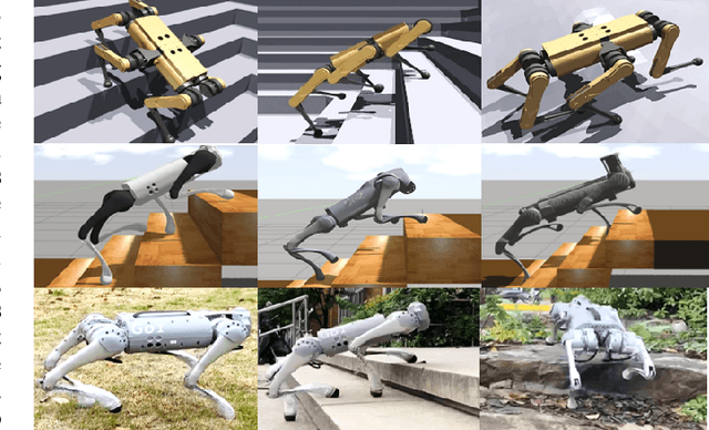 Abstract:Learning multiple gaits is non-trivial for legged robots, especially when encountering different terrains and velocity commands. In this work, we present an end-to-end training framework for learning multiple gaits for quadruped robots, tailored to the needs of robust locomotion, agile locomotion, and user's commands. A latent space is constructed concurrently by a gait encoder and a gait generator, which helps the agent to reuse multiple gait skills to achieve adaptive gait behaviors. To learn natural behaviors for multiple gaits, we design gait-dependent rewards that are constructed explicitly from gait parameters and implicitly from conditional adversarial motion priors (CAMP). We demonstrate such multiple gaits control on a quadruped robot Go1 with only proprioceptive sensors.