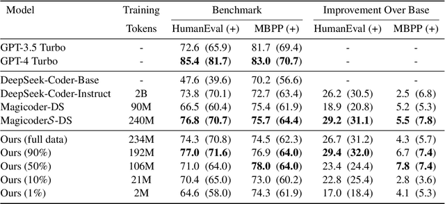 Abstract:Recent work targeting large language models (LLMs) for code generation demonstrated that increasing the amount of training data through synthetic code generation often leads to exceptional performance. In this paper we explore data pruning methods aimed at enhancing the efficiency of model training specifically for code LLMs. We present techniques that integrate various clustering and pruning metrics to selectively reduce training data without compromising the accuracy and functionality of the generated code. We observe significant redundancies in synthetic training data generation, where our experiments demonstrate that benchmark performance can be largely preserved by training on only 10% of the data. Moreover, we observe consistent improvements in benchmark results through moderate pruning of the training data. Our experiments show that these pruning strategies not only reduce the computational resources needed but also enhance the overall quality code generation.