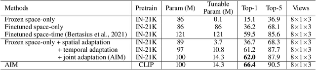 Abstract:Recent vision transformer based video models mostly follow the ``image pre-training then finetuning" paradigm and have achieved great success on multiple video benchmarks. However, full finetuning such a video model could be computationally expensive and unnecessary, given the pre-trained image transformer models have demonstrated exceptional transferability. In this work, we propose a novel method to Adapt pre-trained Image Models (AIM) for efficient video understanding. By freezing the pre-trained image model and adding a few lightweight Adapters, we introduce spatial adaptation, temporal adaptation and joint adaptation to gradually equip an image model with spatiotemporal reasoning capability. We show that our proposed AIM can achieve competitive or even better performance than prior arts with substantially fewer tunable parameters on four video action recognition benchmarks. Thanks to its simplicity, our method is also generally applicable to different image pre-trained models, which has the potential to leverage more powerful image foundation models in the future. The project webpage is \url{https://adapt-image-models.github.io/}.