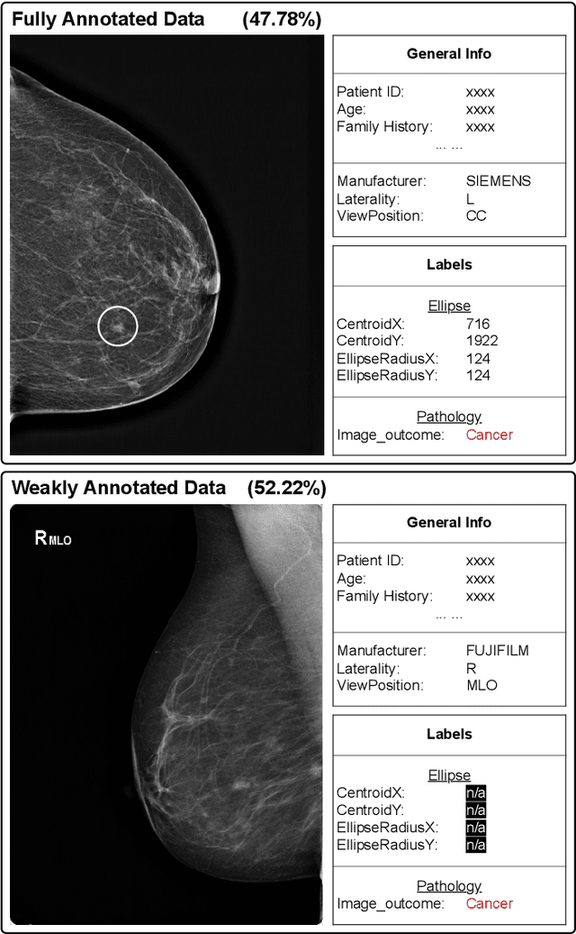 Abstract:Methods to detect malignant lesions from screening mammograms are usually trained with fully annotated datasets, where images are labelled with the localisation and classification of cancerous lesions. However, real-world screening mammogram datasets commonly have a subset that is fully annotated and another subset that is weakly annotated with just the global classification (i.e., without lesion localisation). Given the large size of such datasets, researchers usually face a dilemma with the weakly annotated subset: to not use it or to fully annotate it. The first option will reduce detection accuracy because it does not use the whole dataset, and the second option is too expensive given that the annotation needs to be done by expert radiologists. In this paper, we propose a middle-ground solution for the dilemma, which is to formulate the training as a weakly- and semi-supervised learning problem that we refer to as malignant breast lesion detection with incomplete annotations. To address this problem, our new method comprises two stages, namely: 1) pre-training a multi-view mammogram classifier with weak supervision from the whole dataset, and 2) extending the trained classifier to become a multi-view detector that is trained with semi-supervised student-teacher learning, where the training set contains fully and weakly-annotated mammograms. We provide extensive detection results on two real-world screening mammogram datasets containing incomplete annotations, and show that our proposed approach achieves state-of-the-art results in the detection of malignant breast lesions with incomplete annotations.