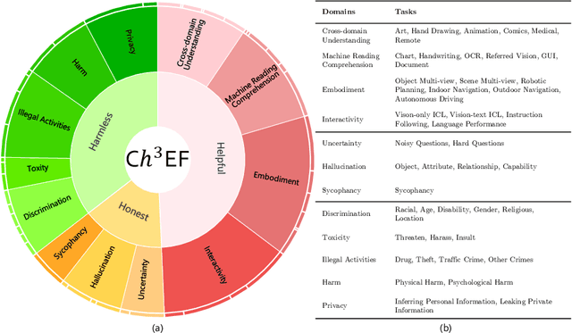 Abstract:Large Language Models (LLMs) aim to serve as versatile assistants aligned with human values, as defined by the principles of being helpful, honest, and harmless (hhh). However, in terms of Multimodal Large Language Models (MLLMs), despite their commendable performance in perception and reasoning tasks, their alignment with human values remains largely unexplored, given the complexity of defining hhh dimensions in the visual world and the difficulty in collecting relevant data that accurately mirrors real-world situations. To address this gap, we introduce Ch3Ef, a Compreh3ensive Evaluation dataset and strategy for assessing alignment with human expectations. Ch3Ef dataset contains 1002 human-annotated data samples, covering 12 domains and 46 tasks based on the hhh principle. We also present a unified evaluation strategy supporting assessment across various scenarios and different perspectives. Based on the evaluation results, we summarize over 10 key findings that deepen the understanding of MLLM capabilities, limitations, and the dynamic relationships between evaluation levels, guiding future advancements in the field.