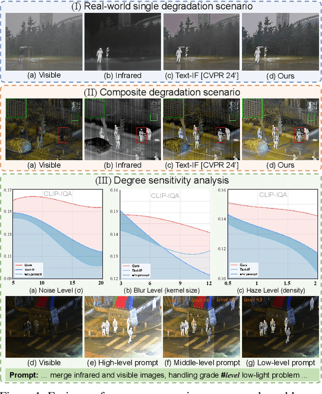 Abstract:Current image fusion methods struggle to address the composite degradations encountered in real-world imaging scenarios and lack the flexibility to accommodate user-specific requirements. In response to these challenges, we propose a controllable image fusion framework with language-vision prompts, termed ControlFusion, which adaptively neutralizes composite degradations. On the one hand, we develop a degraded imaging model that integrates physical imaging mechanisms, including the Retinex theory and atmospheric scattering principle, to simulate composite degradations, thereby providing potential for addressing real-world complex degradations from the data level. On the other hand, we devise a prompt-modulated restoration and fusion network that dynamically enhances features with degradation prompts, enabling our method to accommodate composite degradation of varying levels. Specifically, considering individual variations in quality perception of users, we incorporate a text encoder to embed user-specified degradation types and severity levels as degradation prompts. We also design a spatial-frequency collaborative visual adapter that autonomously perceives degradations in source images, thus eliminating the complete dependence on user instructions. Extensive experiments demonstrate that ControlFusion outperforms SOTA fusion methods in fusion quality and degradation handling, particularly in countering real-world and compound degradations with various levels.