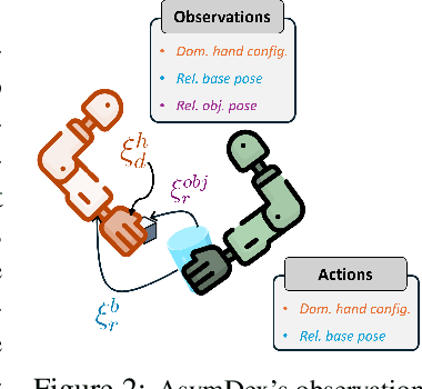Abstract:We present Asymmetric Dexterity (AsymDex), a novel reinforcement learning (RL) framework that can efficiently learn asymmetric bimanual skills for multi-fingered hands without relying on demonstrations, which can be cumbersome to collect. Two crucial ingredients enable AsymDex to reduce the observation and action space dimensions and improve sample efficiency. First, AsymDex leverages the natural asymmetry found in human bimanual manipulation and assigns specific and interdependent roles to each hand: a facilitating hand that moves and reorients the object, and a dominant hand that performs complex manipulations on said object. Second, AsymDex defines and operates over relative observation and action spaces, facilitating responsive coordination between the two hands. Further, AsymDex can be easily integrated with recent advances in grasp learning to handle both the object acquisition phase and the interaction phase of bimanual dexterity. Unlike existing RL-based methods for bimanual dexterity, which are tailored to a specific task, AsymDex can be used to learn a wide variety of bimanual tasks that exhibit asymmetry. Detailed experiments on four simulated asymmetric bimanual dexterous manipulation tasks reveal that AsymDex consistently outperforms strong baselines that challenge its design choices, in terms of success rate and sample efficiency. The project website is at https://sites.google.com/view/asymdex-2024/.