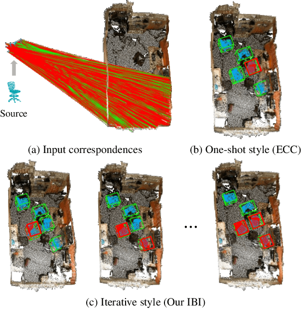 Abstract:Multi-instance registration is a challenging problem in computer vision and robotics, where multiple instances of an object need to be registered in a standard coordinate system. In this work, we propose the first iterative framework called instance-by-instance (IBI) for multi-instance 3D registration (MI-3DReg). It successively registers all instances in a given scenario, starting from the easiest and progressing to more challenging ones. Throughout the iterative process, outliers are eliminated continuously, leading to an increasing inlier rate for the remaining and more challenging instances. Under the IBI framework, we further propose a sparse-to-dense-correspondence-based multi-instance registration method (IBI-S2DC) to achieve robust MI-3DReg. Experiments on the synthetic and real datasets have demonstrated the effectiveness of IBI and suggested the new state-of-the-art performance of IBI-S2DC, e.g., our MHF1 is 12.02%/12.35% higher than the existing state-of-the-art method ECC on the synthetic/real datasets.