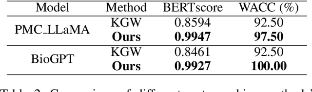 Abstract:Pre-training language models followed by fine-tuning on specific tasks is standard in NLP, but traditional models often underperform when applied to the medical domain, leading to the development of specialized medical pre-trained language models (Med-PLMs). These models are valuable assets but are vulnerable to misuse and theft, requiring copyright protection. However, no existing watermarking methods are tailored for Med-PLMs, and adapting general PLMs watermarking techniques to the medical domain faces challenges such as task incompatibility, loss of fidelity, and inefficiency. To address these issues, we propose the first training-free backdoor watermarking method for Med-PLMs. Our method uses rare special symbols as trigger words, which do not impact downstream task performance, embedding watermarks by replacing their original embeddings with those of specific medical terms in the Med-PLMs' word embeddings layer. After fine-tuning the watermarked Med-PLMs on various medical downstream tasks, the final models (FMs) respond to the trigger words in the same way they would to the corresponding medical terms. This property can be utilized to extract the watermark. Experiments demonstrate that our method achieves high fidelity while effectively extracting watermarks across various medical downstream tasks. Additionally, our method demonstrates robustness against various attacks and significantly enhances the efficiency of watermark embedding, reducing the embedding time from 10 hours to 10 seconds.