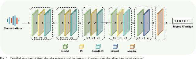Abstract:The rapid development of Artificial Intelligence Generated Content (AIGC) has made high-fidelity generated audio widely available across the Internet, offering an abundant and versatile source of cover signals for covert communication. Driven by advances in deep learning, current audio steganography frameworks are mainly based on encoding-decoding network architectures. While these methods greatly improve the security of audio steganography, they typically employ elaborate training workflows and rely on extensive pre-trained models. To address the aforementioned issues, this paper pioneers a Fixed-Decoder Framework for Audio Steganography with Adversarial Perturbation Generation (FGS-Audio). The adversarial perturbations that carry secret information are embedded into cover audio to generate stego audio. The receiver only needs to share the structure and weights of the fixed decoding network to accurately extract the secret information from the stego audio, thus eliminating the reliance on large pre-trained models. In FGS-Audio, we propose an audio Adversarial Perturbation Generation (APG) strategy and design a lightweight fixed decoder. The fixed decoder guarantees reliable extraction of the hidden message, while the adversarial perturbations are optimized to keep the stego audio perceptually and statistically close to the cover audio, thereby improving resistance to steganalysis. The experimental results show that the method exhibits excellent anti-steganalysis performance under different relative payloads, outperforming existing SOTA approaches. In terms of stego audio quality, FGS-Audio achieves an average PSNR improvement of over 10 dB compared to SOTA method.