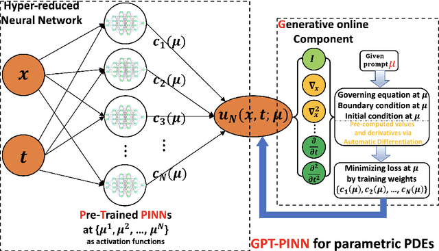 Abstract:We introduce the Transformed Generative Pre-Trained Physics-Informed Neural Networks (TGPT-PINN) for accomplishing nonlinear model order reduction (MOR) of transport-dominated partial differential equations in an MOR-integrating PINNs framework. Building on the recent development of the GPT-PINN that is a network-of-networks design achieving snapshot-based model reduction, we design and test a novel paradigm for nonlinear model reduction that can effectively tackle problems with parameter-dependent discontinuities. Through incorporation of a shock-capturing loss function component as well as a parameter-dependent transform layer, the TGPT-PINN overcomes the limitations of linear model reduction in the transport-dominated regime. We demonstrate this new capability for nonlinear model reduction in the PINNs framework by several nontrivial parametric partial differential equations.