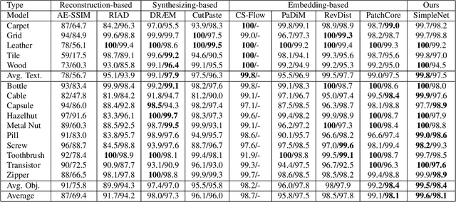 Abstract:We propose a simple and application-friendly network (called SimpleNet) for detecting and localizing anomalies. SimpleNet consists of four components: (1) a pre-trained Feature Extractor that generates local features, (2) a shallow Feature Adapter that transfers local features towards target domain, (3) a simple Anomaly Feature Generator that counterfeits anomaly features by adding Gaussian noise to normal features, and (4) a binary Anomaly Discriminator that distinguishes anomaly features from normal features. During inference, the Anomaly Feature Generator would be discarded. Our approach is based on three intuitions. First, transforming pre-trained features to target-oriented features helps avoid domain bias. Second, generating synthetic anomalies in feature space is more effective, as defects may not have much commonality in the image space. Third, a simple discriminator is much efficient and practical. In spite of simplicity, SimpleNet outperforms previous methods quantitatively and qualitatively. On the MVTec AD benchmark, SimpleNet achieves an anomaly detection AUROC of 99.6%, reducing the error by 55.5% compared to the next best performing model. Furthermore, SimpleNet is faster than existing methods, with a high frame rate of 77 FPS on a 3080ti GPU. Additionally, SimpleNet demonstrates significant improvements in performance on the One-Class Novelty Detection task. Code: https://github.com/DonaldRR/SimpleNet.