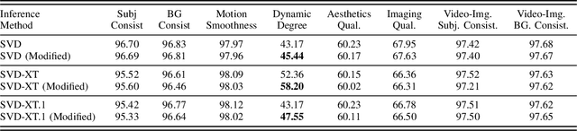 Abstract:This paper investigates the role of CLIP image embeddings within the Stable Video Diffusion (SVD) framework, focusing on their impact on video generation quality and computational efficiency. Our findings indicate that CLIP embeddings, while crucial for aesthetic quality, do not significantly contribute towards the subject and background consistency of video outputs. Moreover, the computationally expensive cross-attention mechanism can be effectively replaced by a simpler linear layer. This layer is computed only once at the first diffusion inference step, and its output is then cached and reused throughout the inference process, thereby enhancing efficiency while maintaining high-quality outputs. Building on these insights, we introduce the VCUT, a training-free approach optimized for efficiency within the SVD architecture. VCUT eliminates temporal cross-attention and replaces spatial cross-attention with a one-time computed linear layer, significantly reducing computational load. The implementation of VCUT leads to a reduction of up to 322T Multiple-Accumulate Operations (MACs) per video and a decrease in model parameters by up to 50M, achieving a 20% reduction in latency compared to the baseline. Our approach demonstrates that conditioning during the Semantic Binding stage is sufficient, eliminating the need for continuous computation across all inference steps and setting a new standard for efficient video generation.