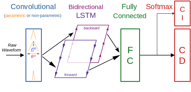 Abstract:In this paper, we analyse the error patterns of the raw waveform acoustic models in TIMIT's phone recognition task. Our analysis goes beyond the conventional phone error rate (PER) metric. We categorise the phones into three groups: {affricate, diphthong, fricative, nasal, plosive, semi-vowel, vowel, silence}, {consonant, vowel+, silence}, and {voiced, unvoiced, silence} and, compute the PER for each broad phonetic class in each category. We also construct a confusion matrix for each category using the substitution errors and compare the confusion patterns with those of the Filterbank and Wav2vec 2.0 systems. Our raw waveform acoustic models consists of parametric (Sinc2Net) or non-parametric CNNs and Bidirectional LSTMs, achieving down to 13.7%/15.2% PERs on TIMIT Dev/Test sets, outperforming reported PERs for raw waveform models in the literature. We also investigate the impact of transfer learning from WSJ on the phonetic error patterns and confusion matrices. It reduces the PER to 11.8%/13.7% on the Dev/Test sets.