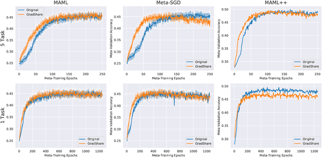 The success of gradient-based meta-learning is primarily attributed to its ability to leverage related tasks to learn task-invariant information. However, the absence of interactions between different tasks in the inner loop leads to task-specific over-fitting in the initial phase of meta-training. While this is eventually corrected by the presence of these interactions in the outer loop, it comes at a significant cost of slower meta-learning. To address this limitation, we explicitly encode task relatedness via an inner loop regularization mechanism inspired by multi-task learning. Our algorithm shares gradient information from previously encountered tasks as well as concurrent tasks in the same task batch, and scales their contribution with meta-learned parameters. We show using two popular few-shot classification datasets that gradient sharing enables meta-learning under bigger inner loop learning rates and can accelerate the meta-training process by up to 134%.