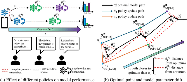 Abstract:Machine learning (ML) algorithms deployed in real-world environments are often faced with the challenge of adapting models to concept drift, where the task data distributions are shifting over time. The problem becomes even more difficult when model performance must be maintained under adherence to strict resource constraints. Existing solutions often depend on drift-detection methods that produce high computational overhead for resource-constrained environments, and fail to provide strict guarantees on resource usage or theoretical performance assurances. To address these shortcomings, we propose RCCDA: a dynamic model update policy that optimizes ML training dynamics while ensuring strict compliance to predefined resource constraints, utilizing only past loss information and a tunable drift threshold. In developing our policy, we analytically characterize the evolution of model loss under concept drift with arbitrary training update decisions. Integrating these results into a Lyapunov drift-plus-penalty framework produces a lightweight policy based on a measurable accumulated loss threshold that provably limits update frequency and cost. Experimental results on three domain generalization datasets demonstrate that our policy outperforms baseline methods in inference accuracy while adhering to strict resource constraints under several schedules of concept drift, making our solution uniquely suited for real-time ML deployments.