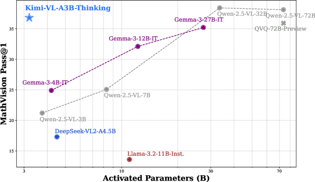 Abstract:We present Kimi-VL, an efficient open-source Mixture-of-Experts (MoE) vision-language model (VLM) that offers advanced multimodal reasoning, long-context understanding, and strong agent capabilities - all while activating only 2.8B parameters in its language decoder (Kimi-VL-A3B). Kimi-VL demonstrates strong performance across challenging domains: as a general-purpose VLM, Kimi-VL excels in multi-turn agent tasks (e.g., OSWorld), matching flagship models. Furthermore, it exhibits remarkable capabilities across diverse challenging vision language tasks, including college-level image and video comprehension, OCR, mathematical reasoning, and multi-image understanding. In comparative evaluations, it effectively competes with cutting-edge efficient VLMs such as GPT-4o-mini, Qwen2.5-VL-7B, and Gemma-3-12B-IT, while surpassing GPT-4o in several key domains. Kimi-VL also advances in processing long contexts and perceiving clearly. With a 128K extended context window, Kimi-VL can process diverse long inputs, achieving impressive scores of 64.5 on LongVideoBench and 35.1 on MMLongBench-Doc. Its native-resolution vision encoder, MoonViT, further allows it to see and understand ultra-high-resolution visual inputs, achieving 83.2 on InfoVQA and 34.5 on ScreenSpot-Pro, while maintaining lower computational cost for common tasks. Building upon Kimi-VL, we introduce an advanced long-thinking variant: Kimi-VL-Thinking. Developed through long chain-of-thought (CoT) supervised fine-tuning (SFT) and reinforcement learning (RL), this model exhibits strong long-horizon reasoning capabilities. It achieves scores of 61.7 on MMMU, 36.8 on MathVision, and 71.3 on MathVista while maintaining the compact 2.8B activated LLM parameters, setting a new standard for efficient multimodal thinking models. Code and models are publicly accessible at https://github.com/MoonshotAI/Kimi-VL.