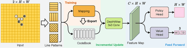 Abstract:Games have played a pivotal role in advancing artificial intelligence, with AI agents using sophisticated techniques to compete. Despite the success of neural network based game AIs, their performance often requires significant computational resources. In this paper, we present Rapfi, an efficient Gomoku agent that outperforms CNN-based agents in limited computation environments. Rapfi leverages a compact neural network with a pattern-based codebook distilled from CNNs, and an incremental update scheme that minimizes computation when input changes are minor. This new network uses computation that is orders of magnitude less to reach a similar accuracy of much larger neural networks such as Resnet. Thanks to our incremental update scheme, depth-first search methods such as the alpha-beta search can be significantly accelerated. With a carefully tuned evaluation and search, Rapfi reached strength surpassing Katagomo, the strongest open-source Gomoku AI based on AlphaZero's algorithm, under limited computational resources where accelerators like GPUs are absent. Rapfi ranked first among 520 Gomoku agents on Botzone and won the championship in GomoCup 2024.